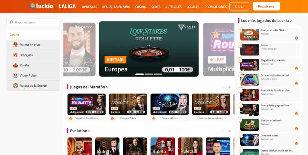 - Casino en directo pensado como complemento a las slots, accesible desde el menú principal.