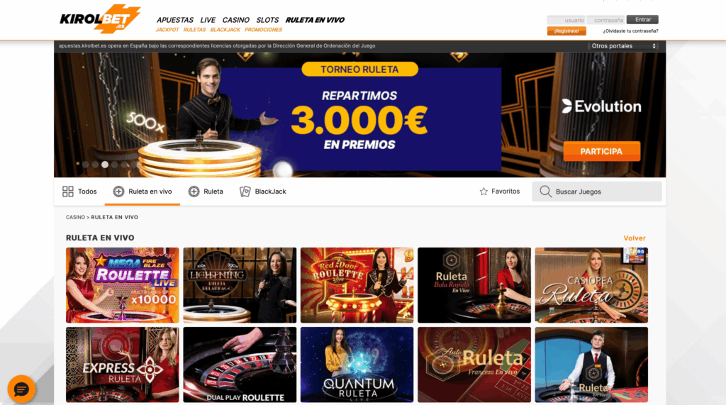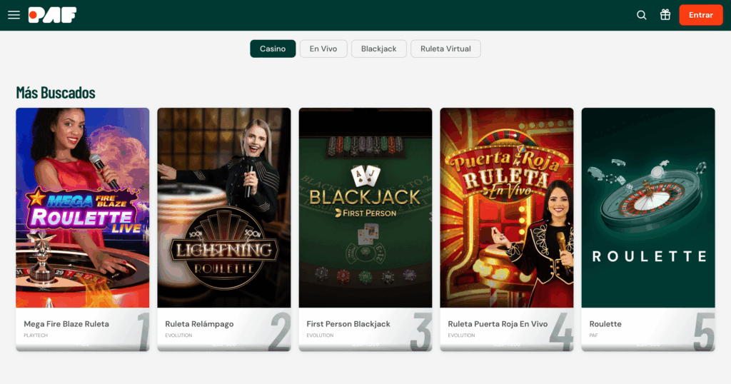 - Amplia sección de casino en directo, con juegos populares como ruleta, blackjack y otros títulos en vivo.